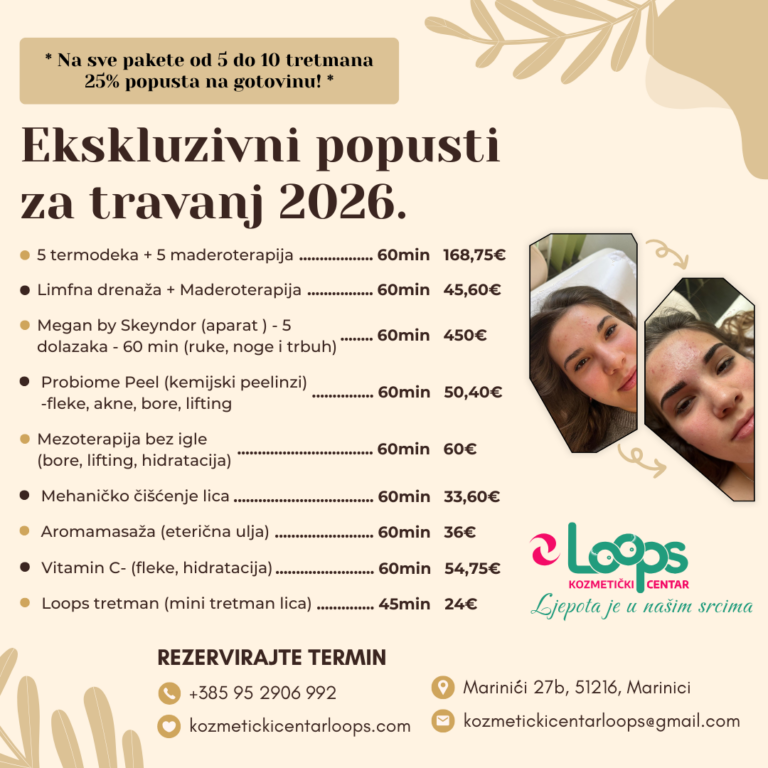 Loops kozmetički centar nudi Vam široku paletu usluga i kozmetike za sve uzraste i spolove. Vrhunskom uslugom ,te savjetovanjem za svakog individualno postižemo odlične rezultate. Loops centar prati trendove proizvoda i najnovijih aparata na tržištu, a isto tako u ponudi imamo i individualne edukacije.